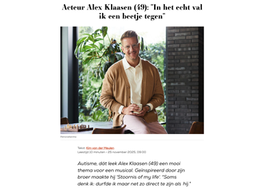 Interview Alex Klaasen (Libelle) 21/12/2025 by Kim Lees het interview hier (€). Libelle, november 2025 Categories: Libelle • Tags: Alex Klaasen, musical, Stoornis of my life, theater
