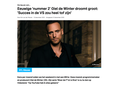 Interview Giel de Winter (RTL Nieuws) 21/12/2025 by Kim RTL Nieuws, december 2025 Lees het interview hier (gratis). Categories: RTL Nieuws • Tags: Giel de Winter, StukTV, Videoland, Waar de F*ck is Stuk
