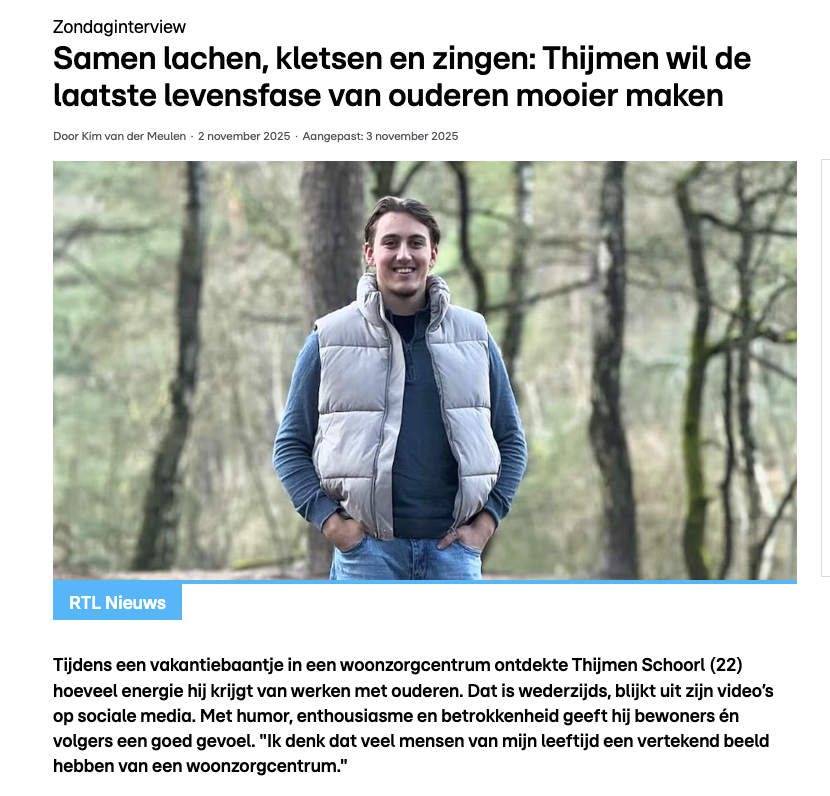 Thijmen wil de laatste levensfase van ouderen mooier maken (RTL Nieuws) Lees het interview hier. RTL Nieuws, 3 november 2025 (beeld: screenshot RTLnieuws.nl)